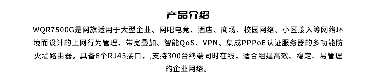 WQR7500G拥有先进的千兆硬件架构,业界先进的最小包转发能力,内置高性能防火墙,具备超强病毒防御能力,丰富的内网安全特性和智能带宽管理功能,人性化的WEB管理和监控界面,为企业构建安全、高速、稳定、智能、易管理的千兆网络。