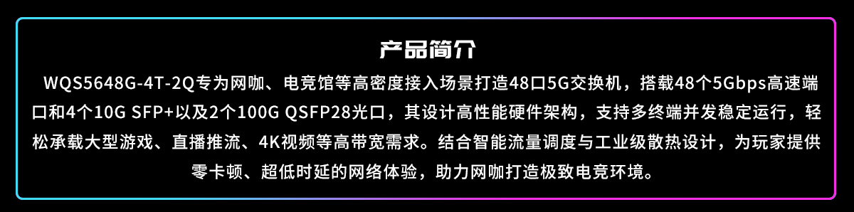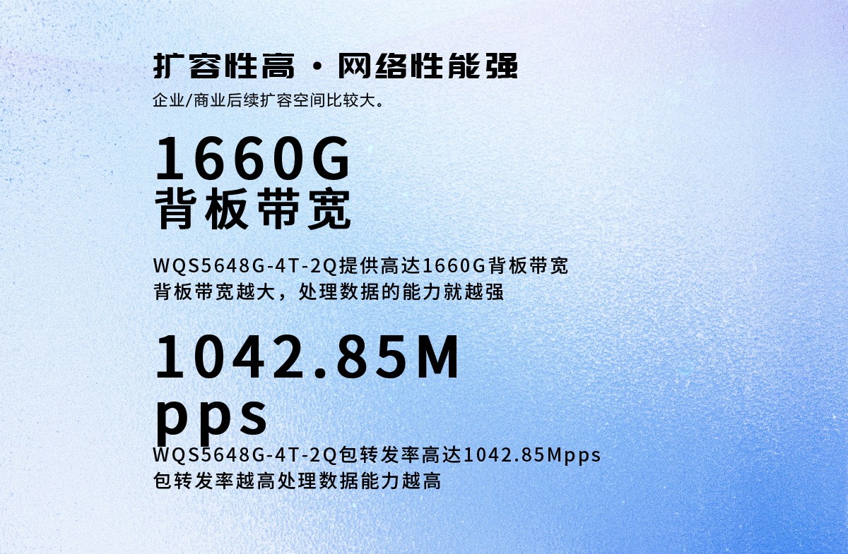WQS5648-4T-2Q 三层网管型交换机,48个5G电口,4个10G,2个40G/100G上行,既可满足下一代企业网、数据中心和城域网对于高密度高带宽的网络 应用需求,也可满足电信网络运营商或园区以太网汇聚层或接入层应用需求。
